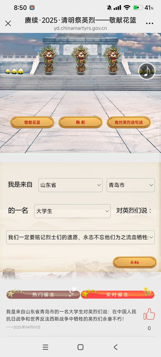 为传承革命传统、赓续红色血脉、厚植爱国情怀,推进党史学习教育常态化,4月2日,beat365正版唯一官网第四(学生)党支部开展“赓续·2025·清明祭英烈”清明节线上祭扫主题党日活动。