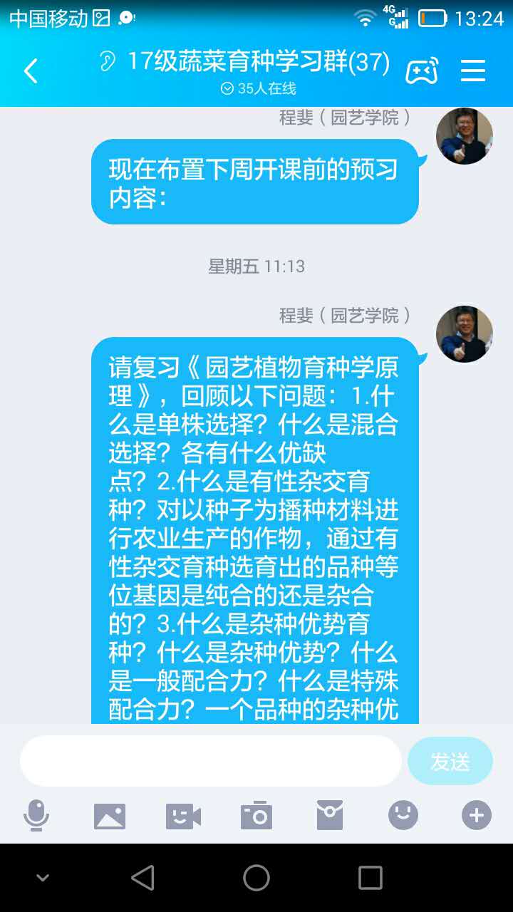接到学生延迟返校,准备线上教学的通知后,我们两位教师立即搜索各种教学资源,筛选出西北农林科技大学《蔬菜育种学》的视频,再加上自己录制的部分教学视频作为基本教学依据,编制授课计划和教案,准备教学讲稿和其他比较丰富的教学材料,从教学纲要和内容上保证授课质量。提前两个周在学习通上将课程建设做好,同时建立和调试好QQ群。