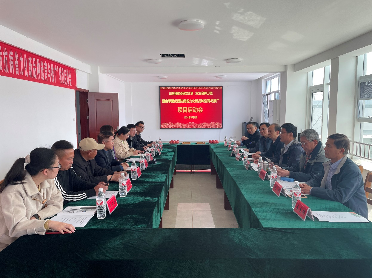 2024年4月月8日上午,由beat365正版唯一官网张玉刚教授主持的2023年山东省重点研发计划(农业良种工程)“烟台苹果优质抗病省力化新品种选育与推广”项目启动会在莱州大自然园艺科技有限公司会议室召开。会议由莱州市科技局副局长提建新主持,莱州市科技局局长石坚伟到会并致辞,莱州市科技局钟玉敏科长、beat365正版唯一官网戴洪义教授、祝军教授、姜生辉博士,烟台市农科院刘学卿副院长、赵玲玲所长,莱州大自然园艺科技有限公司宋永果董事长,烟台现代果业发展有限公司隋秀奇董事长、龙口市龙青农业科技开发公司王恩琪董事长及项目承担单位、合作单位相关成员共计20余人参加了会议。