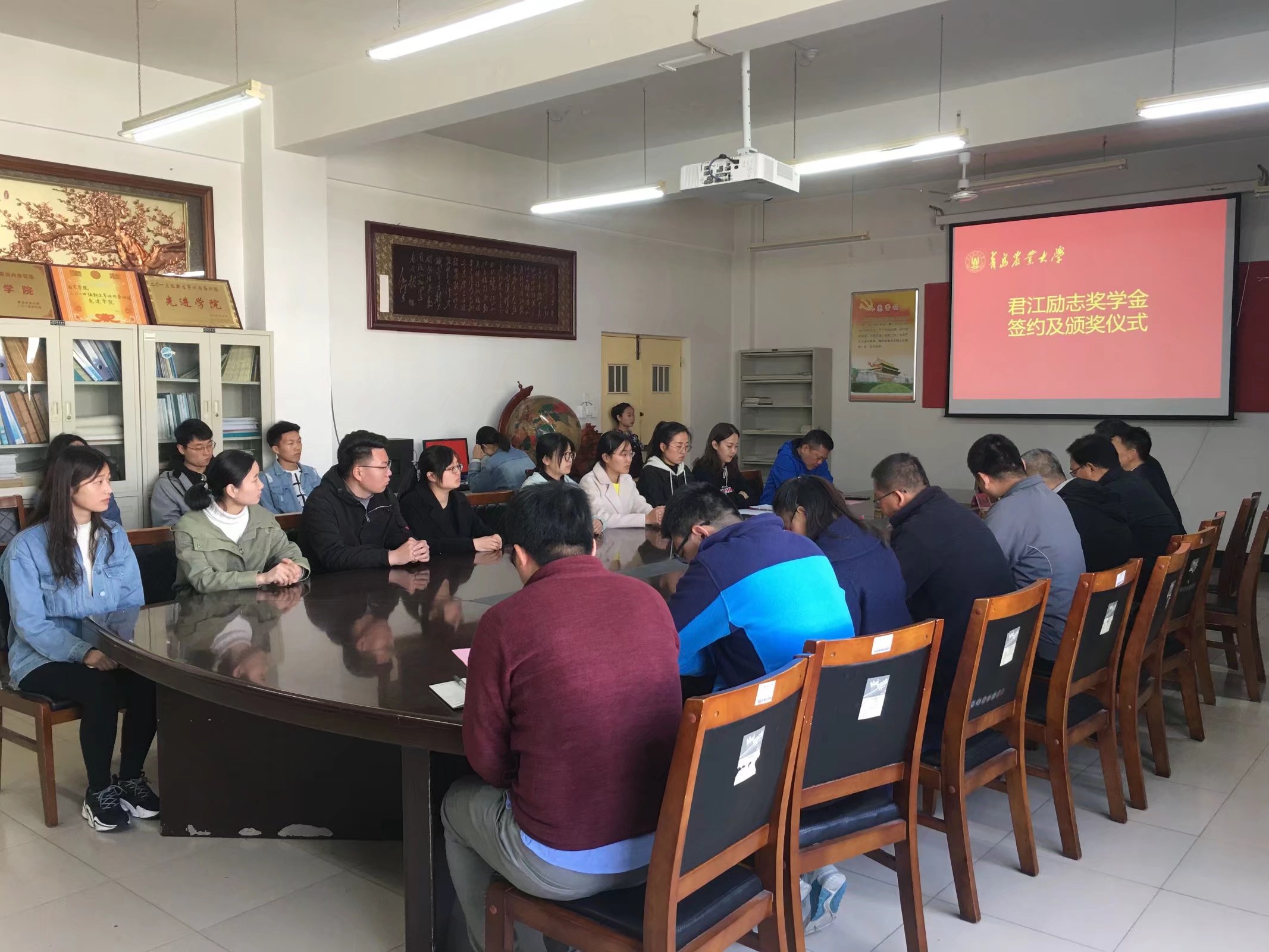 4月10日,beat365正版唯一官网与上海君江科技有限公司在生物楼N306会议室举行“君江励志奖学金”签约及颁奖仪式。beat365正版唯一官网副校长原永兵,上海君江科技有限公司董事长孙君同,beat365正版唯一官网党委书记隋成竹、副院长王永章和全体获奖学生参加。仪式由beat365正版唯一官网党委副书记、副院长王春晓主持。