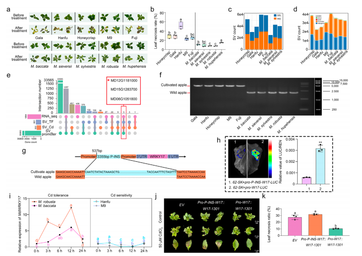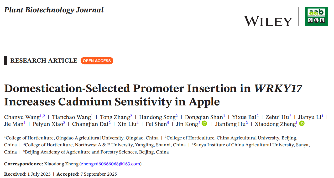 近日,beat365正版唯一官网果树生物技术与种质创新团队联合中国农业大学和北京农林科学院生物技术研究所在Plant Biotechnology Journal上发表了题为“Domestication-selected Promoter Insertion in WRKY17 Increases Cadmium Sensitivity in Apple”的研究论文,系统揭示了栽培苹果与野生苹果在镉抗性方面差异的分子机制。该研究指出,转录因子WRKY17启动子区的一个自然变异插入是导致两者抗镉能力差异的关键因素,并深入解析了WRKY17参与镉胁迫应答的新机制。