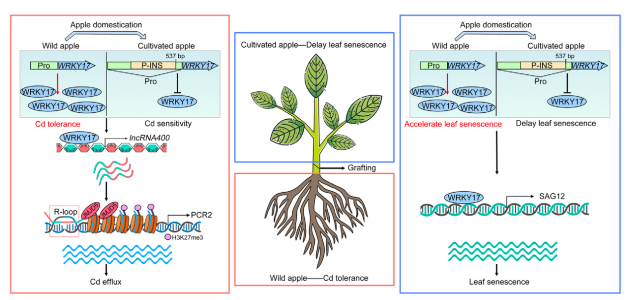 WRKY17启动子区3,355 bp的插入序列(P-INS)是导致耐镉性差异的主要遗传基础。在栽培苹果中,P-INS会抑制WRKY17的表达,从而降低耐镉性;而在缺乏该插入的野生苹果中,WRKY17则被激活表达。进一步研究表明,WRKY17通过诱导长链非编码RNA lncRNA400的表达来增强镉耐受性。LncRNA400会形成R-loop结构,招募组蛋白去甲基化酶JMJD5,从而去除植物镉抗性基因PCR2启动子上的H3K27me3标记,激活PCR2的表达。值得注意的是,WRKY17的激活也会加速叶片衰老,这解释了为何在苹果驯化过程中P-INS得以保留——尽管会降低耐镉性,但通过抑制WRKY17可以维持更好的农艺性状。在现代苹果栽培中,通过将栽培品种接穗嫁接于野生砧木,成功地将野生品种的耐镉特性与栽培品种叶片延迟衰老的特性相结合,为苹果产业应对镉污染提供了切实可行的解决方案。