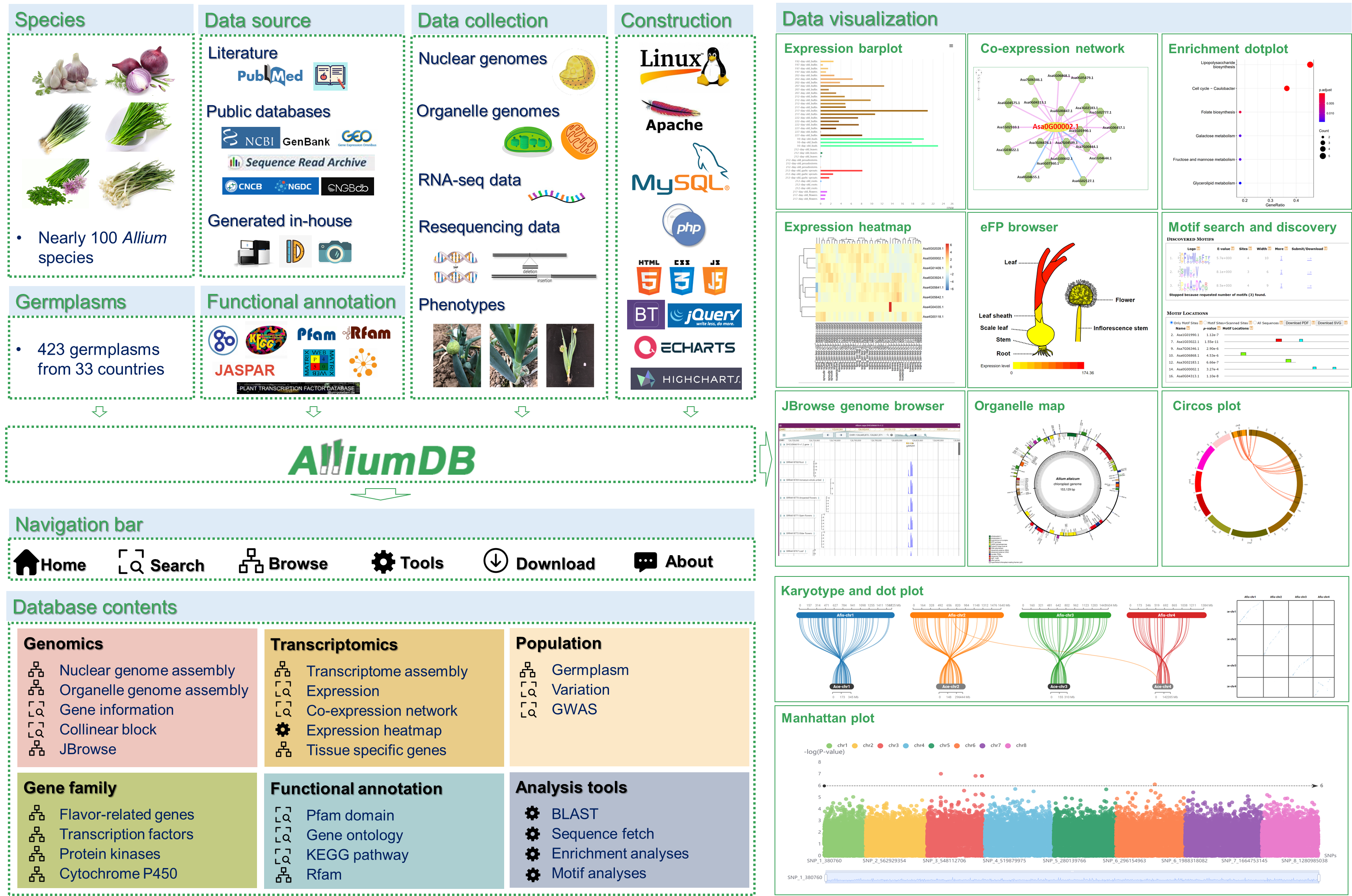 近日,beat365正版唯一官网大葱分子设计育种创新团队在国际著名期刊Horticulture Research发表题为 AlliumDB: A central portal for comparative and functional genomics in Allium的研究论文。该研究通过整合葱属多个物种的基因组、转录组、变异组、表型组等数据,构建了一个葱属比较基因组学和功能基因组学数据库,为葱属作物遗传育种研究提供了重要的数据资源和分析平台。