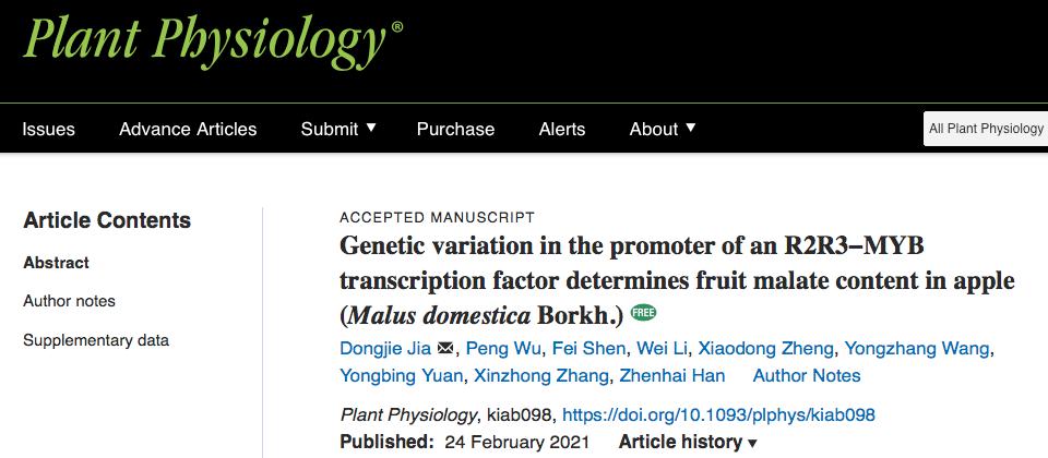 2021年2月24日,beat365正版唯一官网果树分子与发育生物学团队和中国农业大学合作在Plant Physiology(五年影响因子IF=6.902)上在线发表了题为“Genetic variation in the promoter of an R2R3−MYB transcription factor determines fruit malate content in apple (Malus domestica Borkh.)”的研究论文,揭示了苹果果实苹果酸积累调控的新机制。