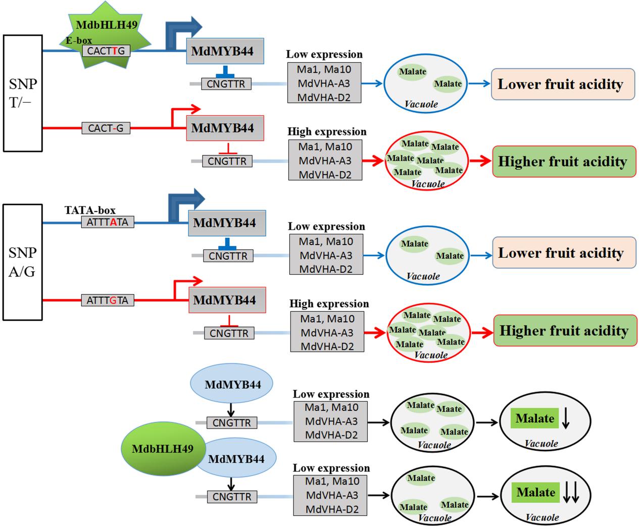 该研究发现,MdMYB44是一个R2-R3类MYB转录因子,将MdMYB44的过表达载体和干扰载体转化苹果愈伤组织和注射苹果果实,证实MdMYB44负向调控苹果酸的积累。并解析了MdMYB44调控苹果酸积累的通路:MdMYB44通过抑制苹果酸相关基因Ma1、Ma10、MdVHA-A3、MdVHA-D2的启动子活性,负向调控果实苹果酸的积累。对苹果不同种质资源基因型分析发现,MdMYB44启动子区域的2个单碱基核酸多样性变异位点SNP T/−与SNP A/G通过组合成不同单倍型控制苹果酸含量,SNP T和SNP A组合成的单倍型中MdMYB44基因高表达引起低苹果酸含量,SNP −和SNP G的组合MdMYB44表达量低导致高苹果酸含量。PlantCARE分析当SNP T/−为T时,为bHLH类转录因子的核心结合元件E-box,该研究鉴定了与该E-box特异性结合的转录因子MdbHLH49,MdbHLH49同时能与MdMYB44互作增强其活性,负向调控果实苹果酸的积累。当 SNP A/G位点为A时,为核心元件TATA-box,该TATA-box能增强MdMYB44的启动子活性。