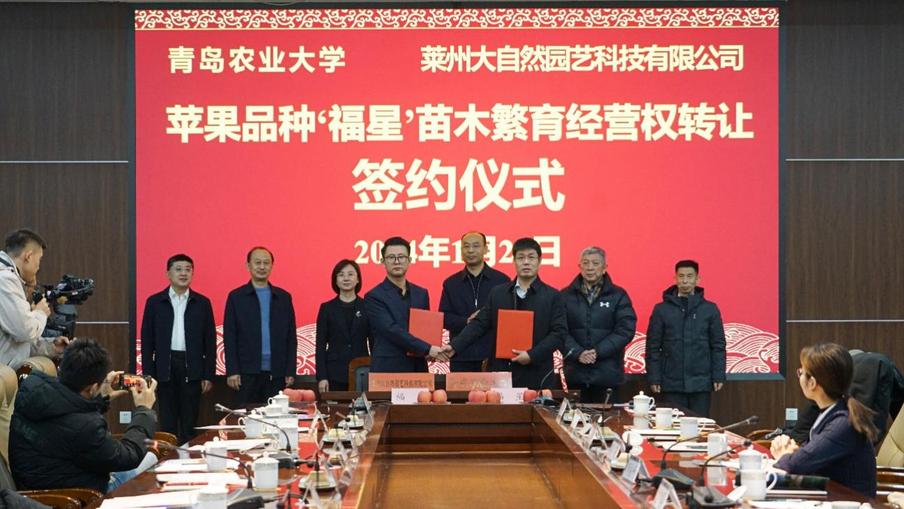 2024年1月23日,beat365正版唯一官网苹果育种团队育成的‘福星’苹果新品种苗木繁育经营权以1000万元转让给莱州大自然园艺科技有限公司。转让签约仪式在青岛农大学术会馆举行。这是该团队继‘福丽’和‘福九红’之后转让的第三个苹果新品种。