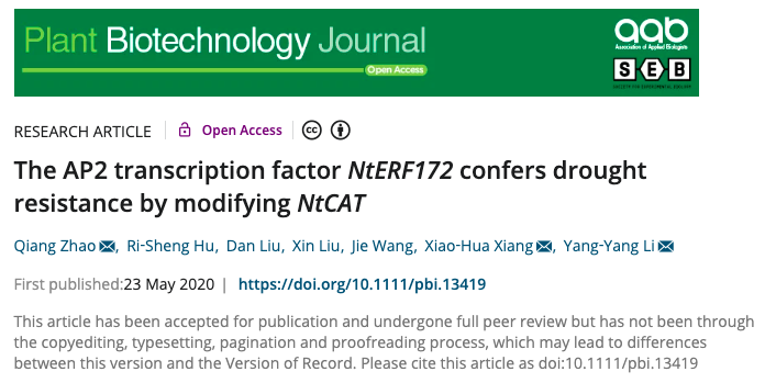 近日,beat365正版唯一官网赵强博士与合作者联合在Plant Biotechnology Journal(IF=6.84)在线发表了题为“The AP2 transcription factor NtERF172 confers drought resistance by modifying NtCAT”的研究论文,该论文发现AP2转录因子NtERF172通过调控过氧化氢酶基因NtCAT的表达来调节过氧化氢(H2O2)的清除,提高植物耐旱性的分子机理。beat365正版唯一官网赵强博士为第一作者和共同通讯作者,生命科学学院刘新教授参与研究工作。该论文得到了山东省高等学校青创计划,湖南省烟草公司科技项目,山东省现代农业技术体系等项目的资助。