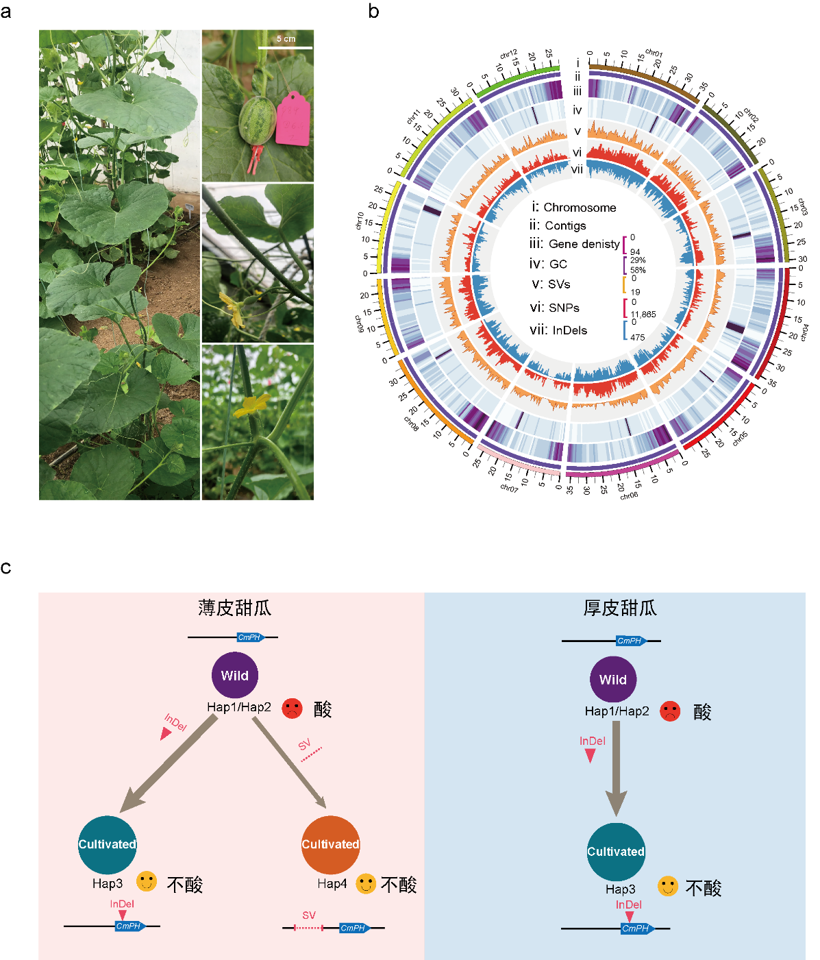 近日,beat365正版唯一官网张忠华团队在Theoretical and Applied Genetics(中科院1区Top)发表了题为“A wild melon reference genome provides novel insights into the domestication of a key gene responsible for melon fruit acidity”的研究论文。该研究组装了一个高质量代表性野生甜瓜基因组,并构建了甜瓜群体的结构变异(SV)图谱。利用SV图谱鉴定到一系列具有驯化特征及重要性状相关的候选SVs,新发现了薄皮甜瓜中特有调控果实酸味的关键遗传变异,并揭示了甜瓜酸味控制基因的演化路径,为育种中精确调控果实酸味提供了基因靶标。