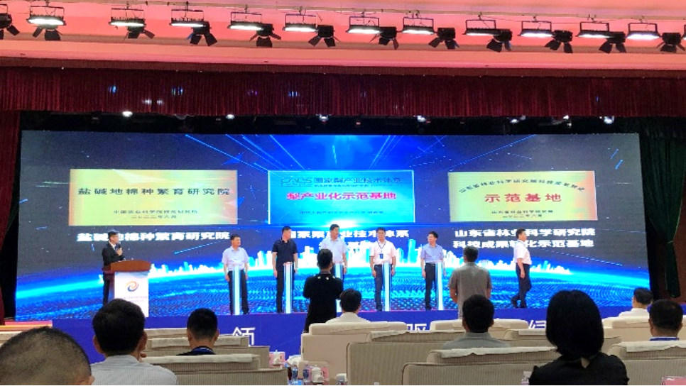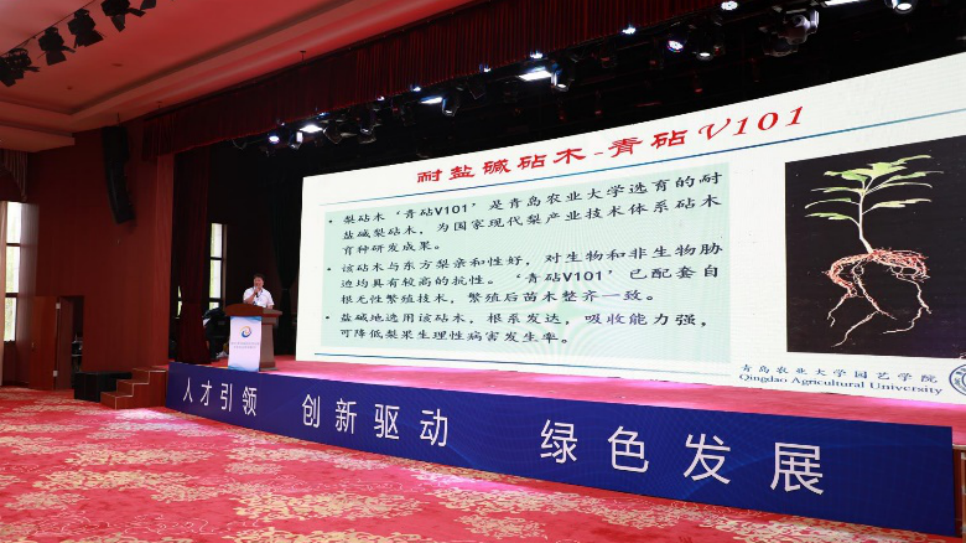 为深入贯彻落实习近平总书记重要指示要求,围绕国家所需、发挥垦利所长,聚力抓好盐碱地综合利用和生态农业创新发展,2022年6月29日,由中共东营市委组织部、东营市科技局、东营市农业农村局、东营市水务局共同参与指导,中共垦利区委、垦利区人民政府举办了“黄河三角洲盐碱地综合利用暨生态农业创新发展论坛”。国家梨产业技术体系砧木评价与改良岗位科学家、beat365正版唯一官网李鼎立教授及团队成员刘建龙副教授参加了会议。会议中,李鼎立教授为国家现代梨产业技术体系产业示范园进行揭牌,并详细推介了国家梨产业技术体系砧木评价与改良岗位成果,包括梨耐盐碱砧木、品种以及配套栽培技术。同时为更好服务国家黄河流域生态保护和高质量发展战略,李鼎立教授和垦利区林业发展服务中心、农业农村局、东营黄河三角洲果树产业技术研究院、山东省林业龙头企业东营市泰欣农林发展有限公司、东营三冠园林有限责任公司围绕耐盐碱梨生态高质量发展,在梨砧木育种、梨生态高质量栽培方面进行了交流研讨,共同谋划展开深入合作。