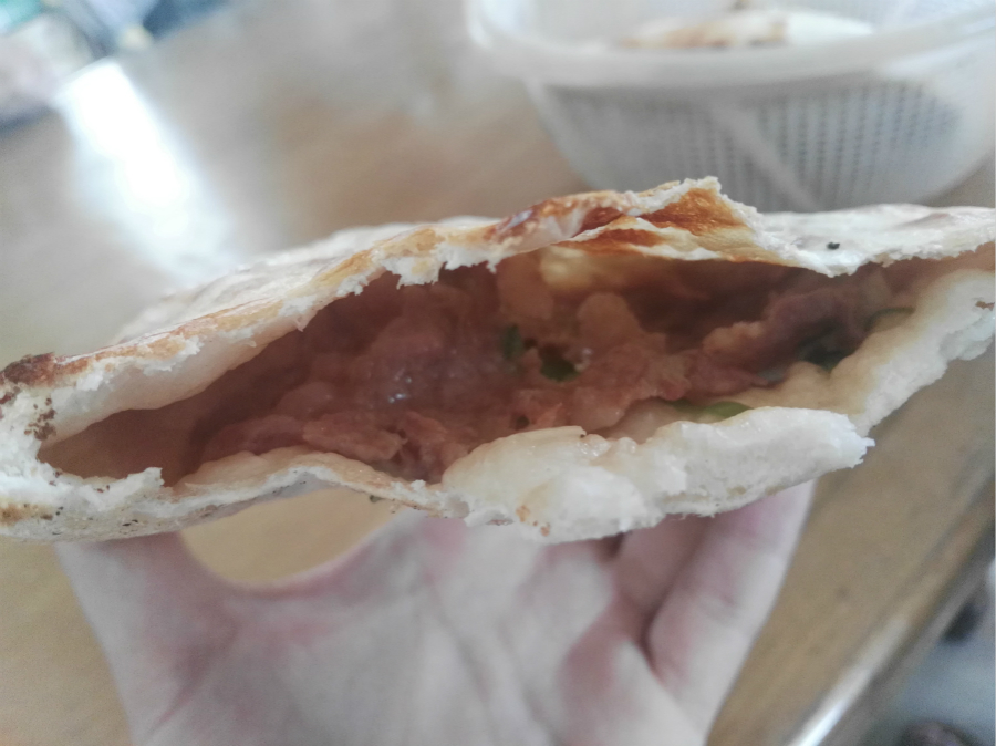 在当地人王师傅的带领下,实践队来到博山最出名的博山烧饼——圣德烧饼,王师傅说,博山烧饼有很多,最正宗的是圣德烧饼,圣德烧饼的制作人已经有很长时间的制作经验,其美味吸引了不少的过路人前来品尝,同时也吸引了CCTV纪录片《中国早餐》前来拍摄。“博山烧饼是当地人的特色早餐,博山烧饼酥而不腻,火候、时间都有讲究”,制作人向我们介绍到。