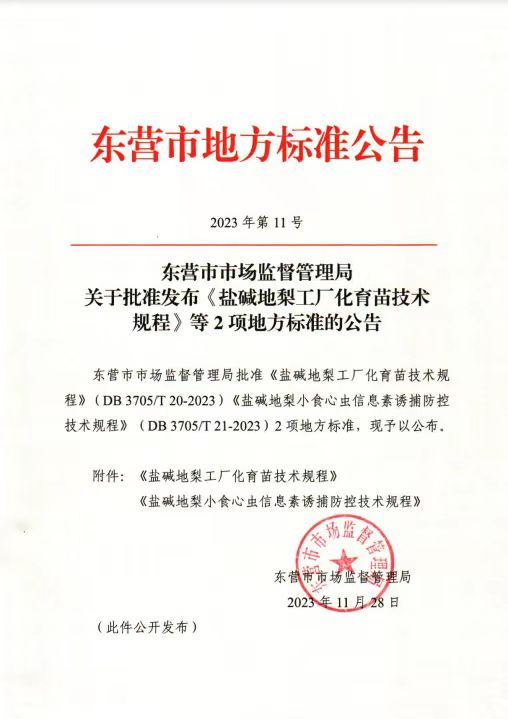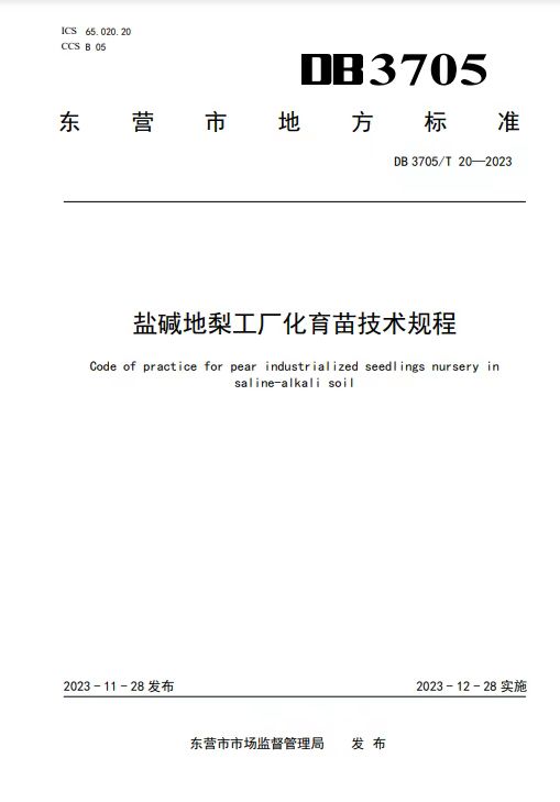 近日,由beat365正版唯一官网梨遗传改良与种质创新团队李鼎立教授作为第一完成人制定的东营市地方标准《盐碱地梨工厂化育苗技术规程》(DB 3705/T20—2023)正式发布,2023年12月28日起实施。