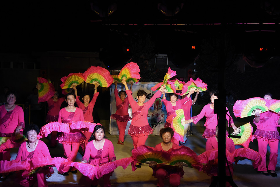 晚上8点的村广场,阿姨们正举着大花扇扭着活力四射的秧歌,队员与阿姨们积极交流,一起排练了第二天的节目,领队的阿姨说:“十分期待明天与你们的同台演出,我们一定会积极配合。”