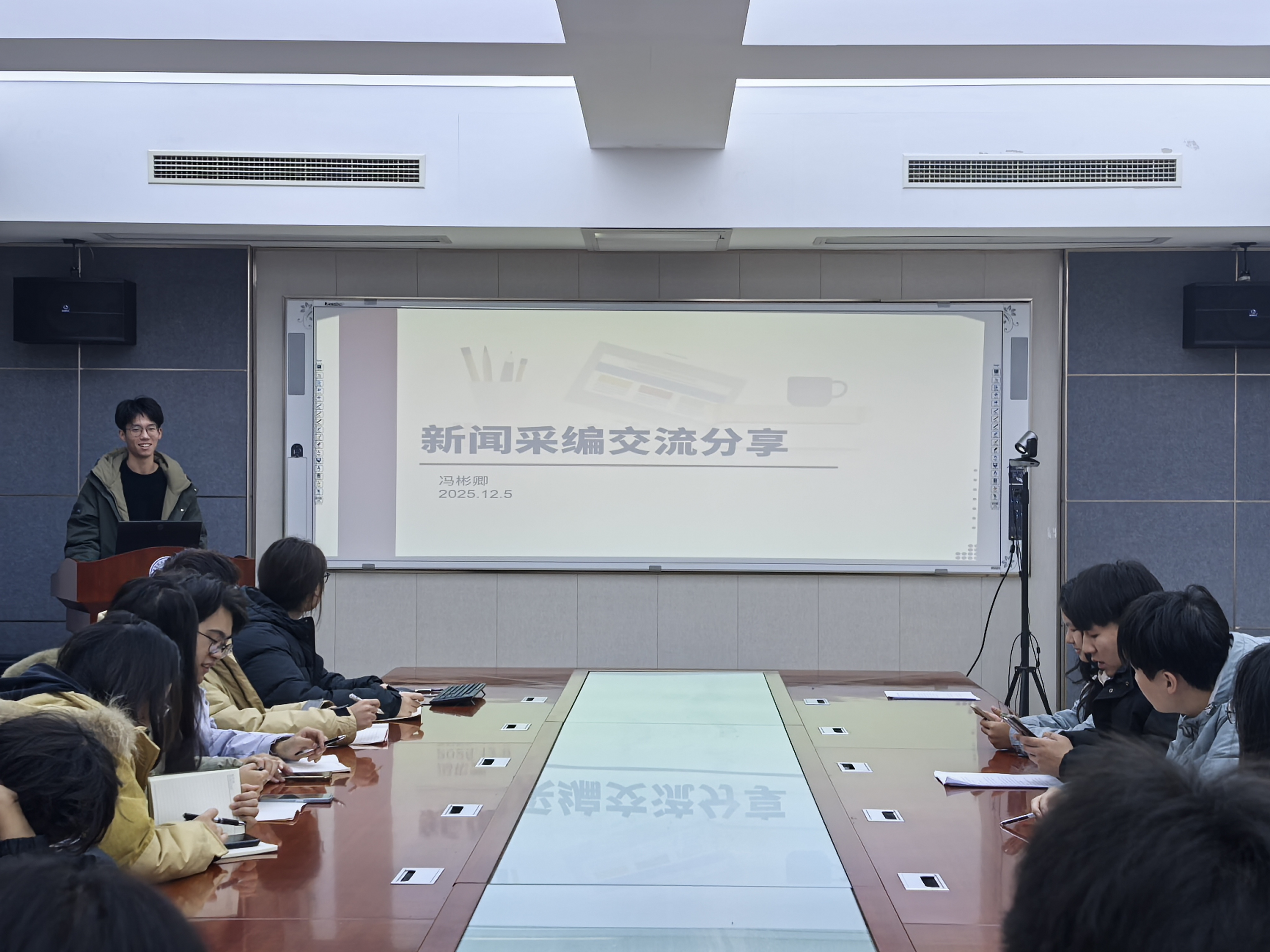 冯彬卿以《新闻采编交流分享》为题,结合媒体写作经验,系统讲解了新闻宣传工作的核心要点。他从“选题策划的三维视角”“素材挖掘的黄金四角”“语言表达的五度原则”三个维度展开,重点阐述了新闻稿件撰写中如何提炼核心亮点、运用数据支撑观点、构建叙事逻辑等内容,并就校园新闻投稿的渠道规范、时效要求、审核流程等实操事项进行详细说明。