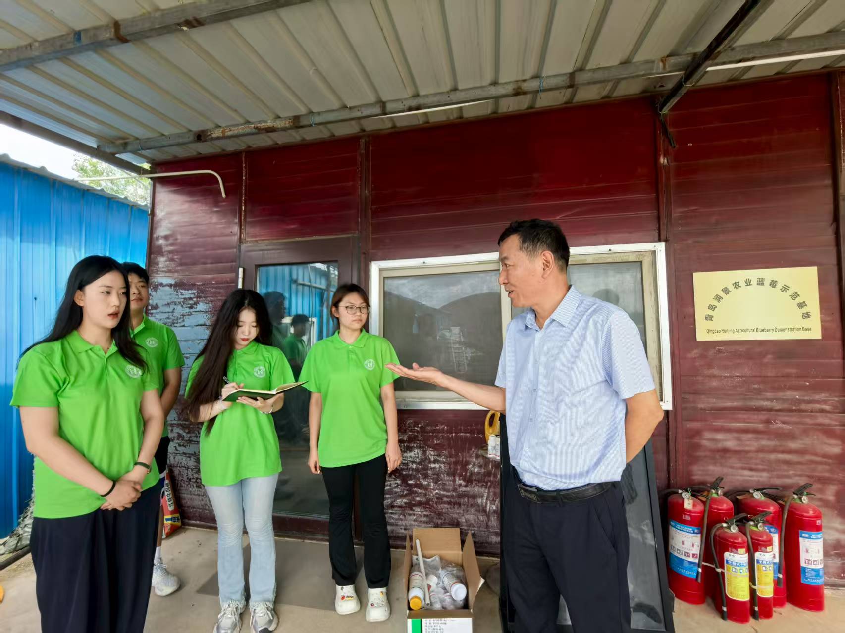 莱西市院上镇小河子村党支部书记张吉玉对实践团的到来表示热烈欢迎,针对基质蓝莓的智能化种植流程进行了细致讲解。当走进水肥一体化智能控制室时,实践团成员们纷纷被眼前的智能科技所震撼——从抽取井水、层层过滤、蓄水存水,到精准配比肥料,整个过程井然有序,而最终的灌溉操作竟能通过手机一键完成,便捷高效的程度让大家赞叹不已,真切感受到了科技为农业生产带来的革新。在交流中,张书记详细介绍了科技小院的发展成果。他提到,2018年通过青岛市科技发展计划项目建成覆盖面积1000平米现代化葡萄日光温室,采用集约密植、单氰胺破眠及平茬修剪技术,实现了一年结果,二年丰产;该栽培模式实现了结果当年亩产值8万元,第二年产值12万元的高产高效栽培目标,充分彰显了科技赋能农业的强劲动力。
