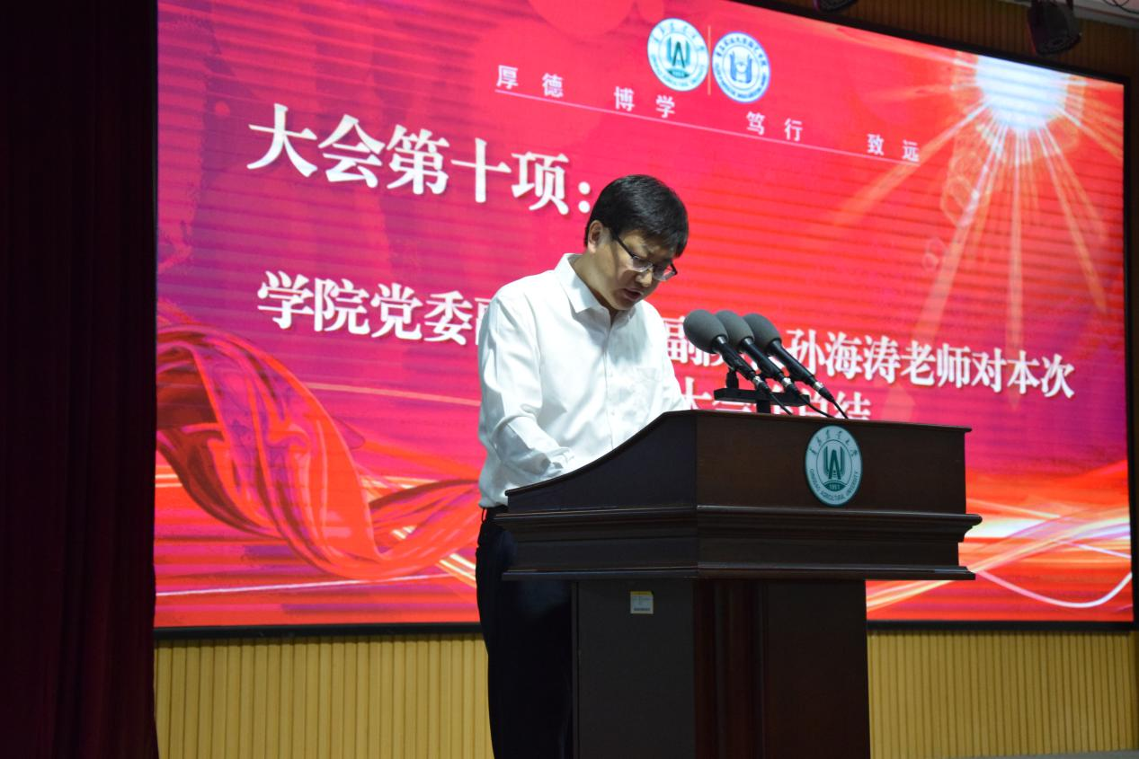 学院党委副书记、副院长孙海涛代表院党委和院行政,对上一届学生组织的辛勤劳动和取得的优异成绩表示感谢和祝贺,对新一届学生组织成员表示欢迎。孙海涛总结回顾了上一学年学院学生组织开展的工作和取得的成绩,分析了学院大学生自我管理工作面临的新形势、新变化,指出了在典型树立、榜样引领、工作创新、优势挖掘等方面存在的问题,希望新一届学生组织成员在新的条件和形势下,少一些杂念、多一份团结;少一些空谈、多一些实干,刻苦钻研、开拓进取,以服务广大同学为宗旨,弘扬“团结奋斗,勤而行之”的优良传统,做好做实各自工作,努力提升学院大学生自我管理工作水平。