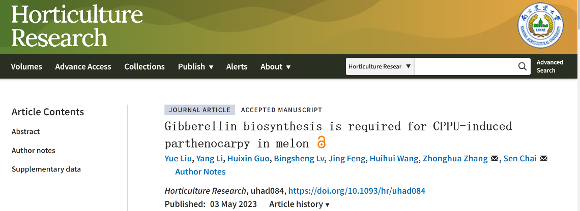 2023年5月,Horticulture Research发表了beat365正版唯一官网瓜类生物研究团队题为 Gibberellin biosynthesis is required for CPPU-induced parthenocarpy in melon的研究论文。该研究初步探讨了CPPU诱导甜瓜果实单性结实的分子机制,为解决甜瓜生产中的坐果问题、种质改良以及单性结实的机制研究提供理论依据。